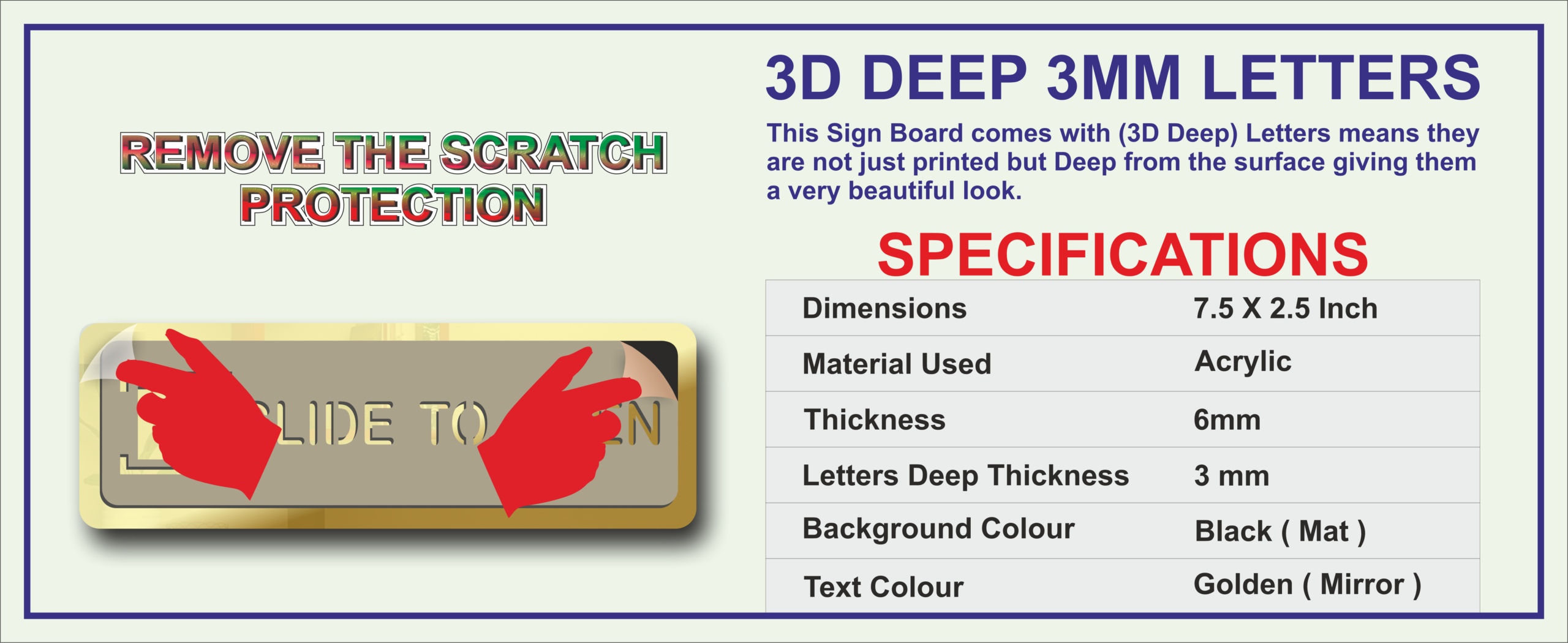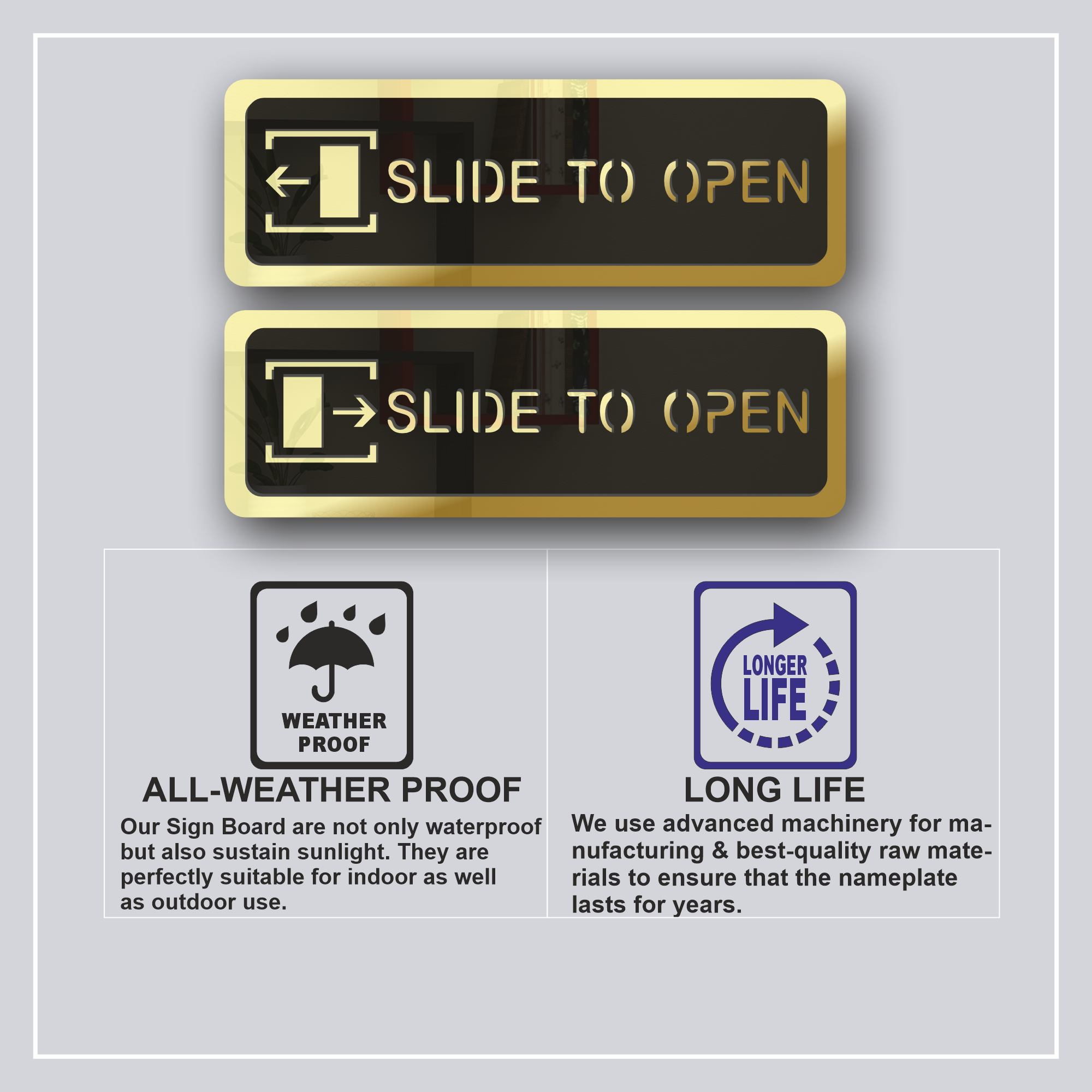 Enhance both functionality and aesthetics with our Slide To Open Door Sign Board – Golden Mirror Acrylic.